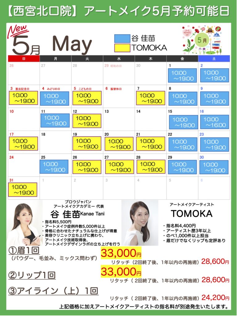 5月アートメイク予約可能日は下記画像の通りとなります。